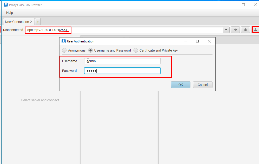 Используя OPC клиент (умеющий производить подключение по заданным логину и паролю) произвести подключение к базе по данным реквизитам (используя логин и пароль доступа к серверу ОИК).