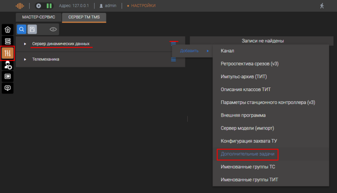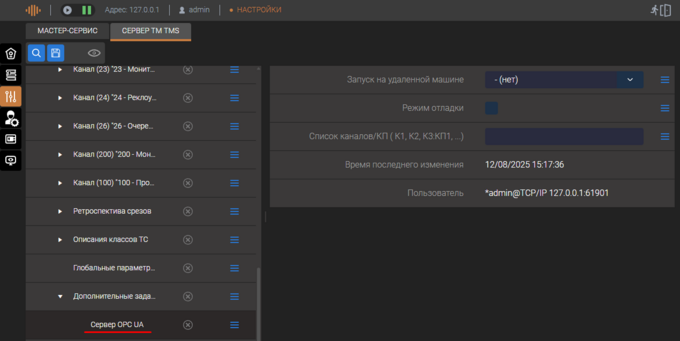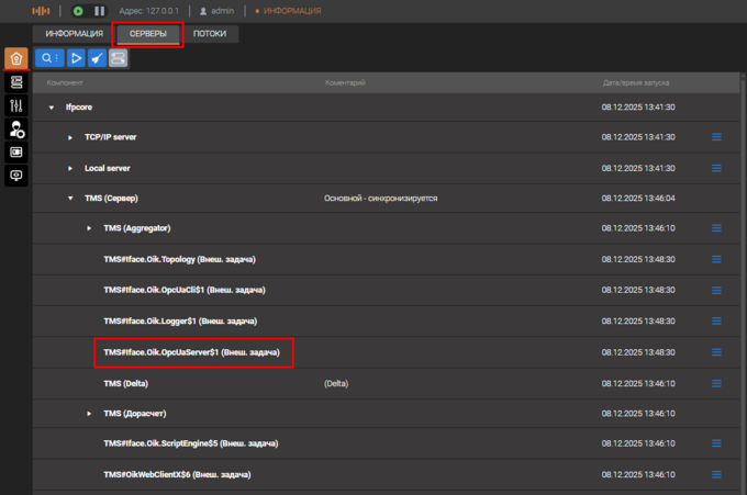 После добавления компонента и перезагрузки ПО сервера (остановка/запуск) задача будет автоматически запущена и предоставит доступ ко всем параметрам структуры ТМС-сервера.