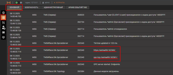 В журнале регистрации событий будет запись с реквизитами, по которым можно удаленно подключиться к службе OPC.
