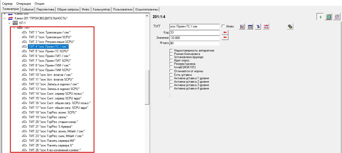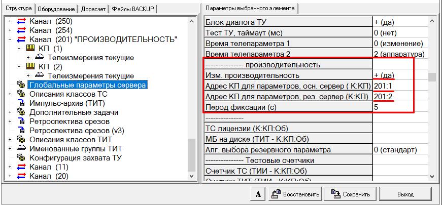 Для настройки необходимо в глобальных параметрах сервера включить функцию "измерять производительность" и указать адреса каналов и КП структуры для значений основного и резервного серверов;