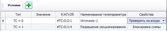 Тип условий может быть ТС=0, ТС=1, либо сравнение телеизмерения(ТТ) с числом указанном в строке «Значение»;