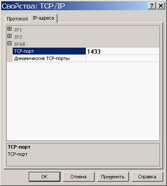 2) В окне «Свойства TCP/IP» на вкладке «Протокол» установить свойство «Включено» - «Да» (см. Рис. 4.21). На вкладке «IP-адреса», в разделе «IPAll» задать параметр «TCP - порт» - «1433» (см. Рис. 4.22). Нажать кнопку «ОК».
