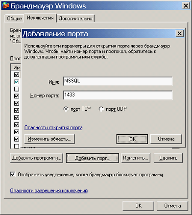 - указать произвольное имя, номер 1433 и тип TCP. Нажать кнопку «ОК»