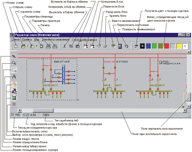Редактирование оперативных схем в режиме псевдографики выполняется в окне, приведенном на Рис. А.1. Интерфейс редактора схем приобретает вид представленный на рисунке для схем типа: