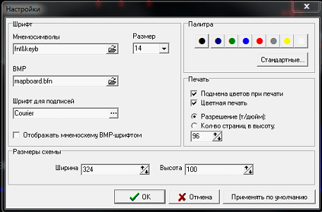 Задать размеры оперативной схемы, определить шрифт, палитру и настроить некоторые параметры для печати можно в окне настройки.