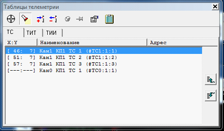 Оперативная схема для ‘оживления’ загружается редактором схем псевдографики (см. Рис. А.9). Используя пункты меню «Элементы оживления» → «Таблица телесигналов» или «Элементы оживления» → «Таблица телеизмерений текущих» открывается окно ‘оживления’ схемы (см. Рис. 7.25)