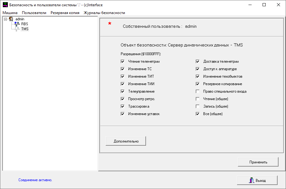 Редактирование дополнительных прав безопасности TMS-сервера ПО «ОИК Диспетчер НТ».