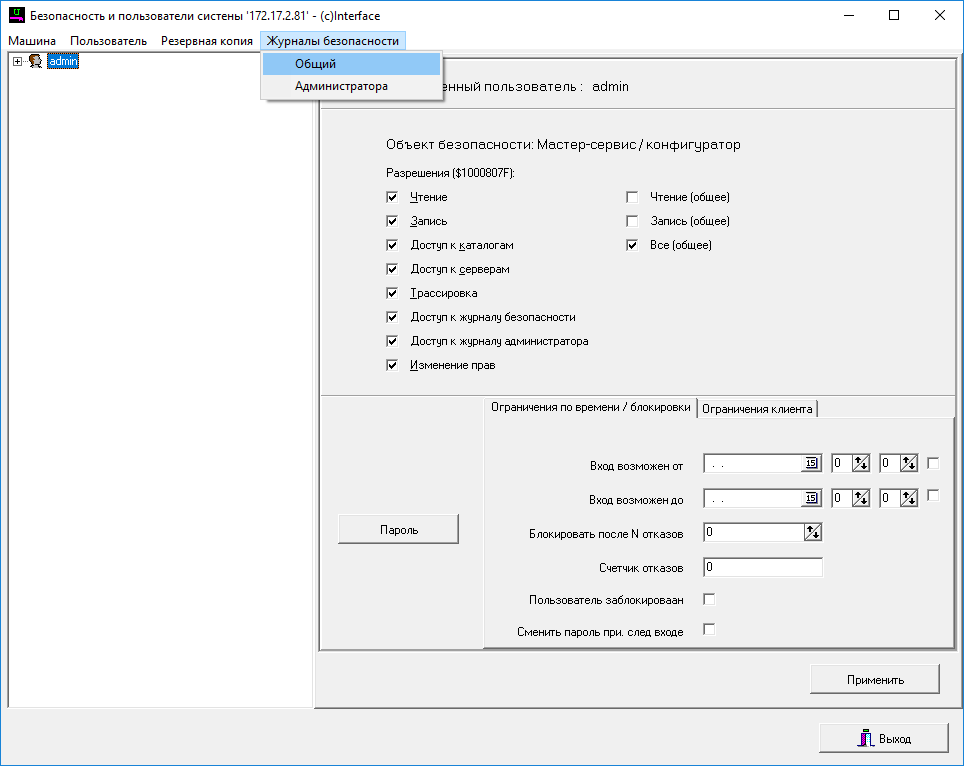 При условии наличия прав на просмотр общего журнала безопасности и журнала администратора, откроется окно просмотра журналов.