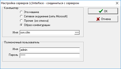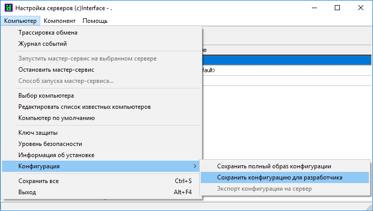 Пункт меню «Экспорт конфигурации на сервер» активируется только в том случае, когда в качестве компьютера для соединения с сервером выбран «Образ конфигурации», сохраненный в файле типа *.cfim.