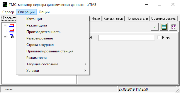 Для перехода в окно «ТМС-монитор» сервера динамических данных необходимо в окне главного меню программы «Настройка серверов» ЛКМ выбрать строку сервера динамических данных (по умолчанию - «TMS (Сетевой сервер)») и ЛКМ нажать на кнопку