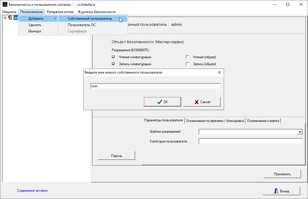 Для добавления пользователя необходимо выбрать пункт меню «Пользователь» - «Добавить» - «Собственный пользователь». В появившемся окне ввести имя пользователя. После внесения имя пользователя изменить пароль вновь созданному пользователю. Пароль вводить согласно используемой парольной политики