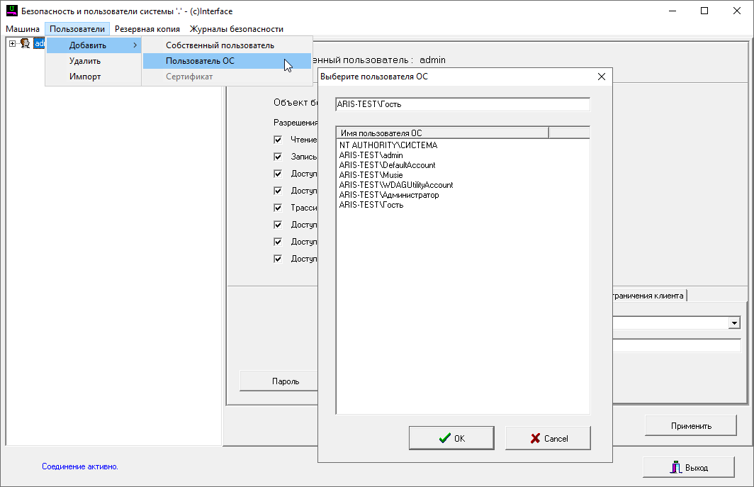 2) Пользователь ОС. При использовании данного типа пользователей, логин и пароль полностью соответствуют установленным значением при описании пользователя ОС.