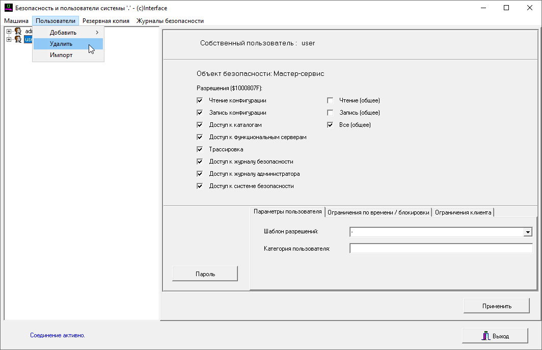Для удаления пользователя необходимо выделить необходимого пользователя, выбрать пункт меню «Пользователь» - «Удалить».