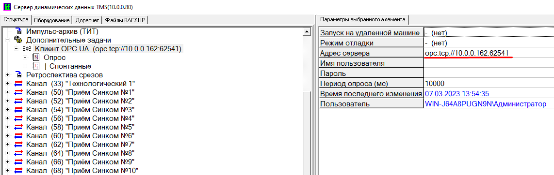 · В настройках задачи клиента OPC UA необходимо указать адрес сервера. При необходимости(если ОРС-сервер поддерживает аутентификацию), указать пользователя и пароль, а так же период опроса для необходимых данных.
