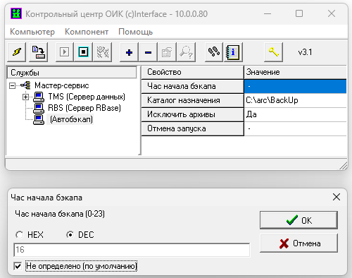 Час начала бэкапа - указывается час в сутках в который будет начинать формироваться копия. Поумолчанию это 16 часов каждого дня, при необходимости данное время можно изменить, не рекомендуется указывать часам начала формирования копии 10 утра, так как в это время происходят формирования суточных файлов импульс-архива и журнала событий;