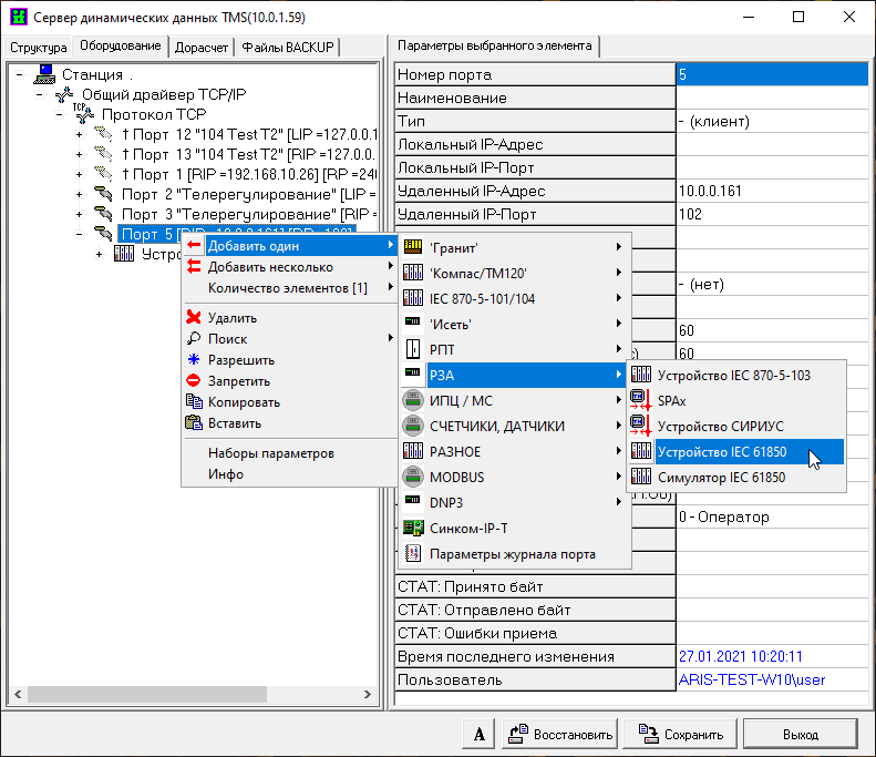 После необходимо добавить устройство IEC 61850 нажав правой кнопкой мыши на уровень порта и выбрав необходимый параметр из списка РЗА устройств.