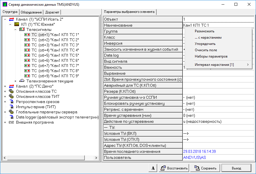 Нажатие ПКМ на панели описания структуры сервера динамических данных активирует контекстное меню настройки структуры сервера динамических данных (см. таблицу).