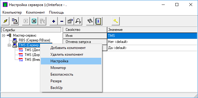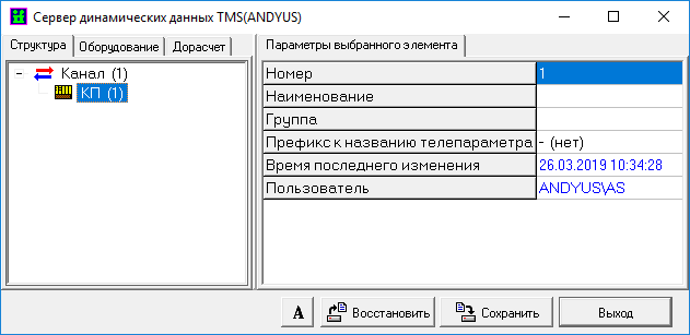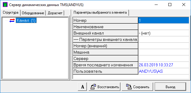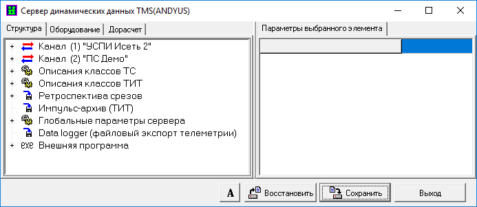 Для перехода в окно настройки структуры сервера динамических данных необходимо в окне главного меню программы «Настройка серверов» ЛКМ выбрать строку сервера динамических данных (по умолчанию - «TMS (Сетевой сервер)») и ЛКМ нажать на кнопку