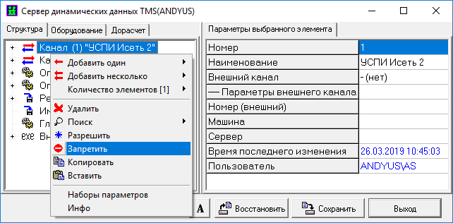 Любой компонент структуры сервера динамических данных может быть временно заблокирован. Для этого следует ЛКМ выбрать блокируемый компонент, ПКМ активировать контекстное меню и выбрать строку меню