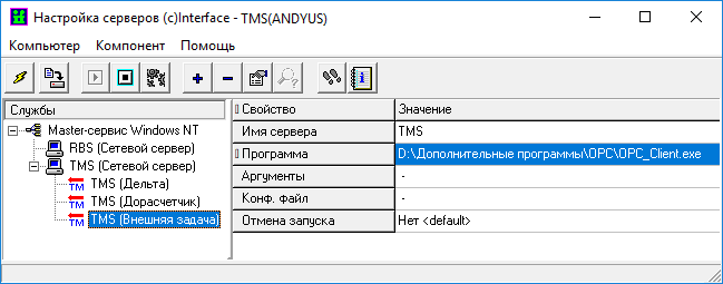 Настройка внешних задач выполняется в окне главного меню программы «Настройка серверов». При настройке должны быть определены следующие параметры: