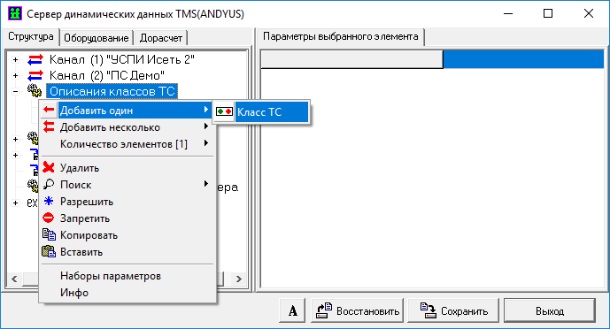 - на панели «Структура» выбрать строку «Описания классов ТС» и через контекстное меню добавить и настроить необходимое количество классов ТС.