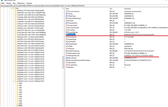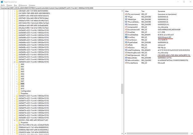 Компьютер\HKEY_LOCAL_MACHINE\SYSTEM\CurrentControlSet\Control\Class\{4d36e972-e325-11ce-bfc1-08002be10318} в нашем случае устройство по адресу 0, находится в каталоге 0008, в нашем случае это "WAN Miniport (IP)"