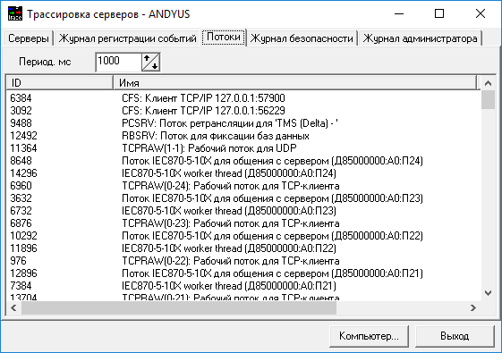 Окно «Трассировки серверов» ПО сервера «ОИК Диспетчер НТ» версии 3.Х.