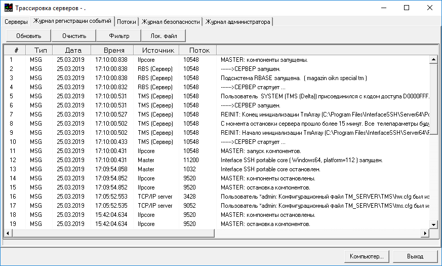 Выбор пунктов меню «Компьютер» → «Журнал событий» или нажатие ЛКМ на кнопку «Журнал» активирует окно главного меню программы «Трассировка серверов» на закладке «Журнал регистрации событий».