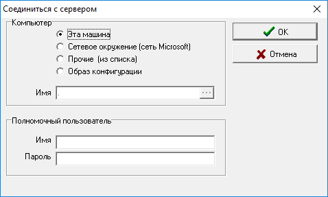 - для удаленной машины выбрать пункты «Сетевое окружение», выбрать машину из выпадающего списка, ввести логин и пароль;