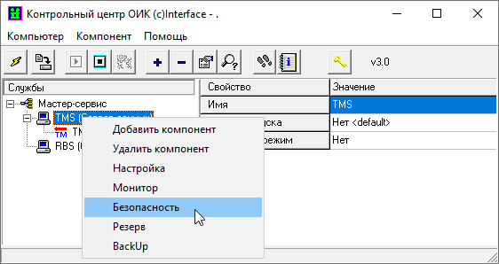 Вызов ПО настройки безопасности можно произвести из модуля контроля ПО «ОИК Диспетчер НТ». Для получения доступа к окну ПО настройки безопасности путём нажатия правой кнопкой мыши на одном из уровней (Мастер-сервис, RBS-сервер, TMS-сервер) в появившемся окне необходимо выбрать строку «Безопасность».