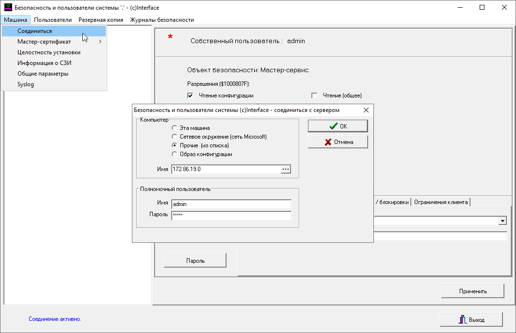 ПО настройки безопасности позволяет осуществлять подключение к локальным и удаленным компьютерам с установленными ПО сервера «ОИК Диспетчер НТ» версии 3.Х. Для этого необходимо выбрать пункт меню «Машина» - «Соединиться». В появившемся окне авторизации указать параметры подключения: