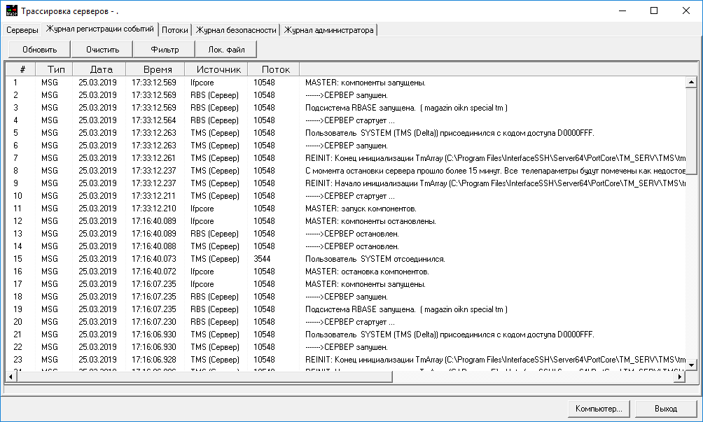 Выбор пункта меню «Журнал событий» активирует окно трассировки серверов на закладке «Журнал регистрации событий». В версии 3.Х. для просмотра так же доступны вкладки «Журнал безопасности» и «Журнал администратора», ознакомиться с подробной информации о данных журналах можно в разделе 7.5.8. При просмотре журнала можно воспользоваться фильтром отбора событий. Окно настройки параметров фильтра отбора записей приведено на рисунке.