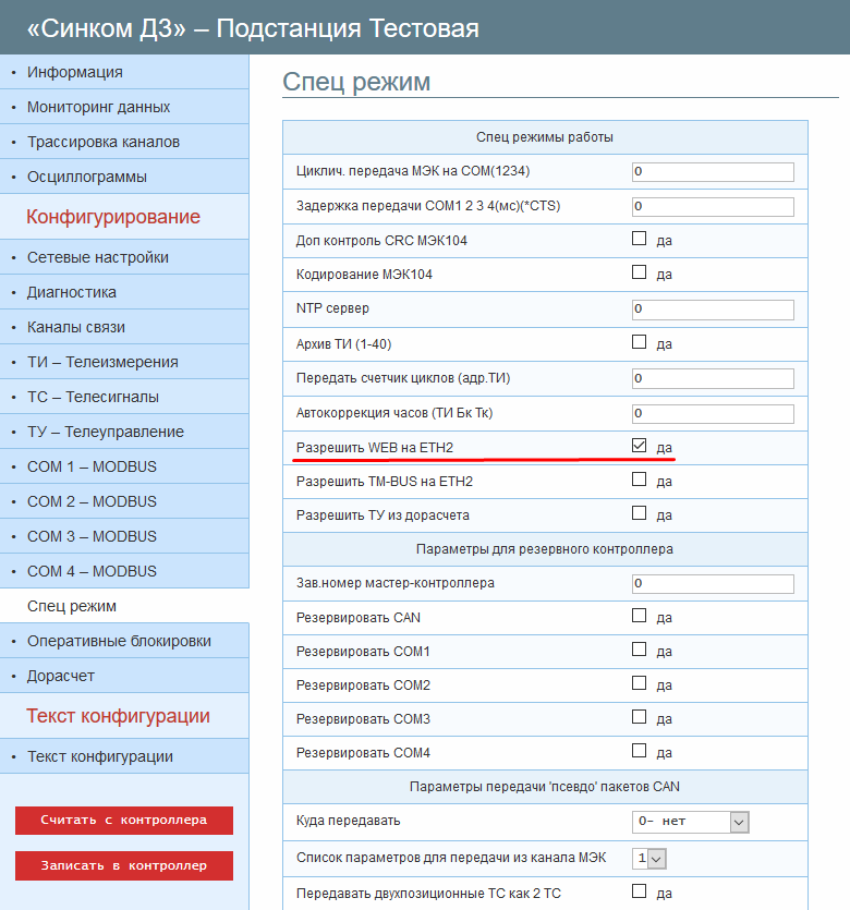 Чтобы разрешить доступ к Web-конфигуратору через порт Ethernet 2 необходимо перейти на вкладку «Спец режим» и поставить галочку в пункте «Разрешить Web на ETH2»;