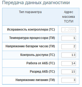 Все контроллеры серии «Синком-Д» позволяют настроить передачу на верхний уровень диагностических ТС и ТИ контроллера «Исправность контроллера», «Температура процессора» и «Напряжение батареи часов». Контроллеры «Синком-ДКП» и «Синком-ДКП»/13,8 также позволяют передавать ТС и ТИ «Контроль доступа», «Работа от АКБ», «Разряд АКБ» и «Напряжение питания».