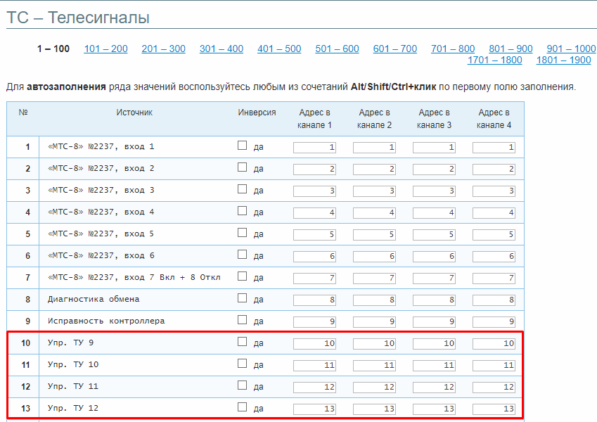 Для выбранных телесигналов, необходимо настроить адресацию в каждом канале. Для этого необходимо перейти на вкладу "ТС - Телесигналы", настроенные ТС будут выделены записью "Упр. ТУ №" в строках параметра "Источник", для каждого ТС заполнить параметр "Адрес в канале".