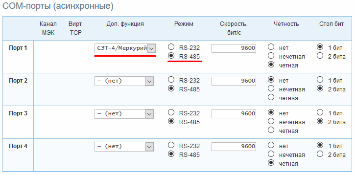 Задать параметру «Доп. функция» портов, которые планируется задействовать, значение «СЭТ-4/Меркурий».