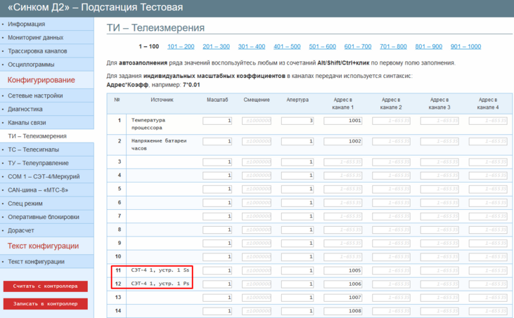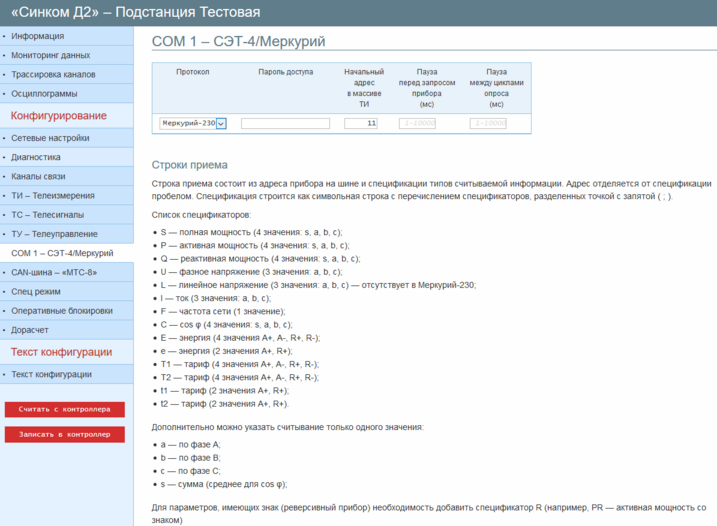Контроллеры серии «Синком-Д» поддерживают считывание значений ТИ с устройств, работающих по протоколам СЭТ-4 и Меркурий.