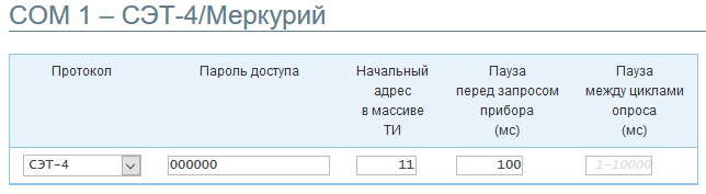 Пример: Порт контроллера COM 1 будет опрашивать подключенные приборы по протоколу СЭТ-4. Пароль доступа к приборам – 000000. Полученные ТИ будут записываться в массив ТИ контроллера начиная с адреса 11. Пазу между выполнением запросов каждой строки приёма составит 100 мс.