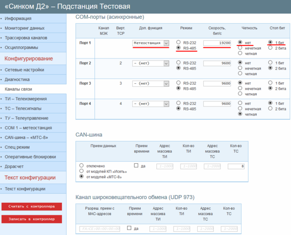 Контроллеры серии «Синком-Д» поддерживают считывание значений ТИ с метеостанции WXT520 по интерфейсу RS485.