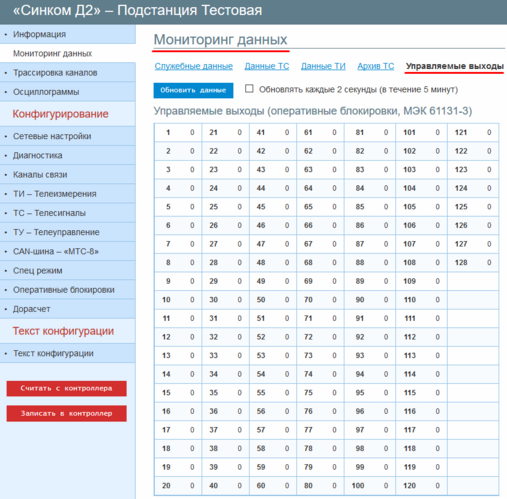 После завершения настройки, на вкладке «Мониторинг данных» в закладке «Управляемые выходы» можно посмотреть текущее состояние выходов оперативных блокировок.