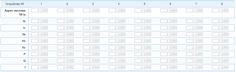 Второй тип пакета телеизмерений (см. раздел 7.3.1.8 стандарта МЭК-103), предоставляет следующий набор данных: Iа (ток фазы А), Ib (ток фазы B), Ic (ток фазы C), Va (напряжение фазы А), Vb (напряжение фазы B), Vc (напряжение фазы C), Р (активная мощность), Q (реактивная мощность), f (частота). Для каждого параметра указывается адрес в массиве ТИ контроллера.