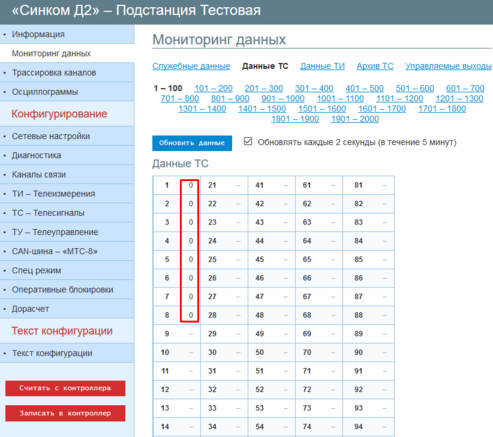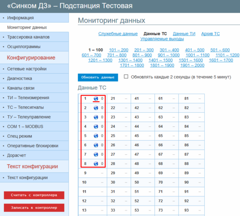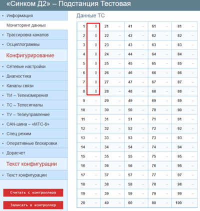 Пример: Контроллер «Синком-Д2» получает 8 ТС от модуля серии «МТС-8», которые записываются в массив ТС контроллера по адресам с 1 до 8. Контроллер «Синком-Д3» соединён с контроллером «Синком-Д2» шиной «Исеть TM-BUS». Так как контроллеры находятся в едином адресном пространстве, ТС полученные в контроллером «Синком-Д2» также отражаются в массиве контроллера «Синком-Д3». Специальный знак рядом со значением ТС во вкладке «Мониторинг данных» отражает что ТС получены по шине «Исеть TM-BUS».