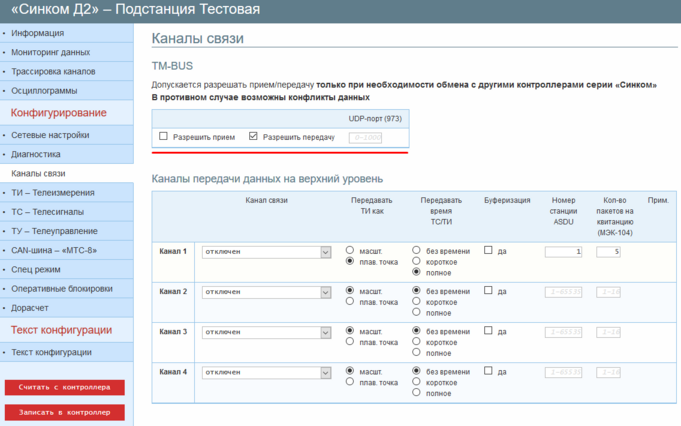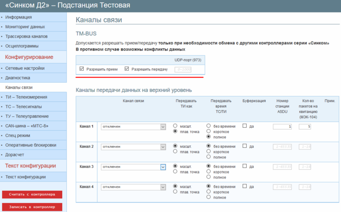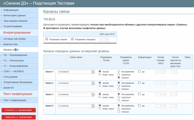 Если контроллер должен выдавать телеметрию в шину «TM-Bus» или на «верхний уровень», то необходимо установить признак «Разрешить передачу».