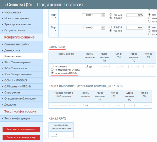 В разделе «CAN-шина» установить параметр «Приём данных» в положение «от модулей КП "Исеть"» для модулей младше версии 5, и «от модулей "МТС-8"» для модулей версии 5 и старше.