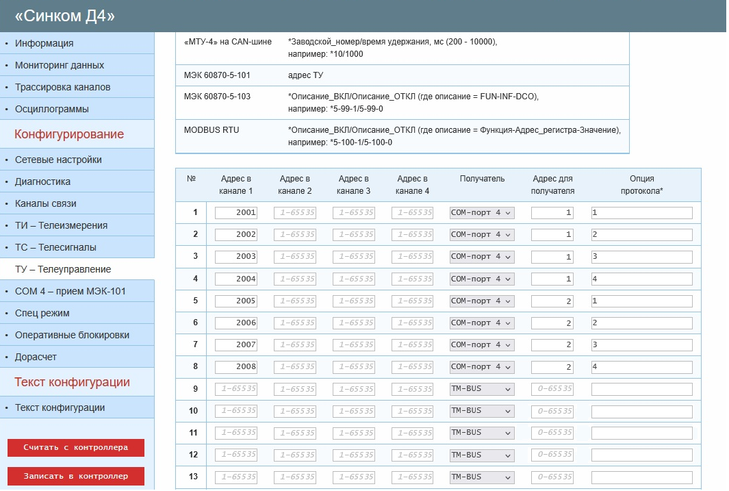 Пример: в примере ниже контроллер ретранслирует полученные от верхнего уровня ТУ с адресами 2001-2012.