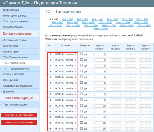 После настройки, ТС и ТИ каждого из запросов (14 ТС и 8 ТИ на запрос) будут отражены во вкладках «ТС – Телесигналы» и «ТИ – Телеизмерения» в соответствии со значениями параметров «Начальный адрес в массиве ТС/ТИ».