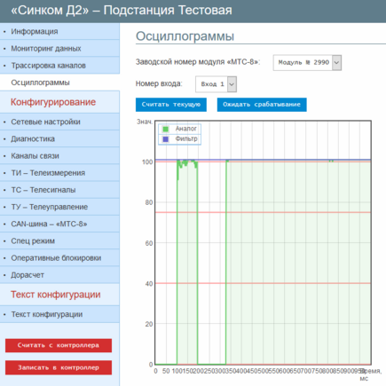 Каждый из контроллеров серии «Синком-Д» позволяет просматривать осциллограммы входов модулей серии «МТС-8», подключенных к контроллеру. На осциллограмме отражается состояние одного входа на отрезке времени, равном 1 сек. Значение сигнала на осциллограмме отображается в процентах от значения напряжения на входе (100% соответствуют напряжению блока питания входных цепей модуля).