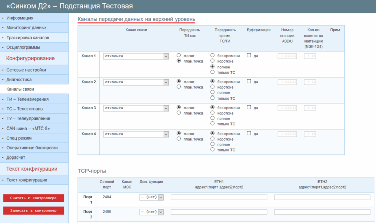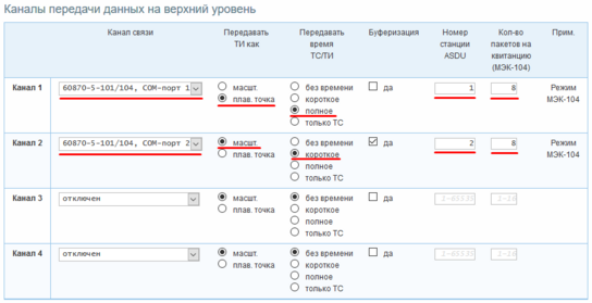 Пример: Канал связи 1 будет передавать данные на «верхний уровень» в протоколе МЭК 60870-5-104 через TCP-порт 1. ТИ будут передаваться в формате числа с плавающей точке. Метки времени спорадических ТИ будут передаваться в полном формате. Номер ASDU – 1. Количество пакетов на квитанцию – 8. Архив спорадических ТС при установлении соединения передаваться не будет. Канал связи 2 будет передавать данные на «верхний уровень» в протоколе МЭК 60870-5-104 через TCP-порт 2. ТИ будут передаваться в масштабируемом формате. Метки времени спорадических ТИ будут передаваться в коротком формате. Номер ASDU – 2. Количество пакетов на квитанцию – 8. При установлении соединения будет предан архив 256 спорадических ТС.