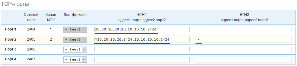 Для порта Eth1 контроллера: TCP-порт №1 находится в режиме ожидания соединения от клиента с IP-адресом 20.20.20.20 и клиента с адресом 10.10.10.10 и исходящим портом 2424. TCP-порт №2 находится в режиме попыток соединения («Клиент» TCP) с IP-адресами 20.20.20.20 и 10.10.10.10 по портам 2424.