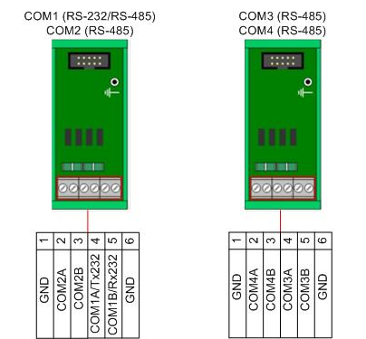 Для подключения внешних цепей к COM-портам контроллера рекомендуется использовать клеммник COM-порта контроллера «Синком-ДК». Клеммник подключается к контроллеру с помощью десятижильного кабеля с разъёмами IDC-10 – IDC-10 (1 к 1). Для подключения внешних цепей используется винтовые клеммы для кабелей сечением до 2.5мм2.